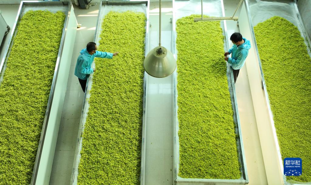 4月1日,工作人員在湖南省衡陽(yáng)市衡山縣開(kāi)云鎮雙全新村生態(tài)茶場(chǎng)整理篩選茶葉(無(wú)人機照片)。