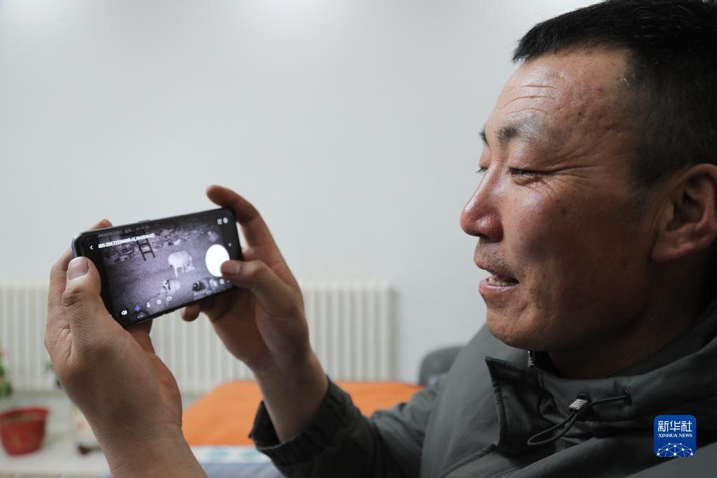 3月28日,朝克德力根展示手機上的羊圈監控影像。