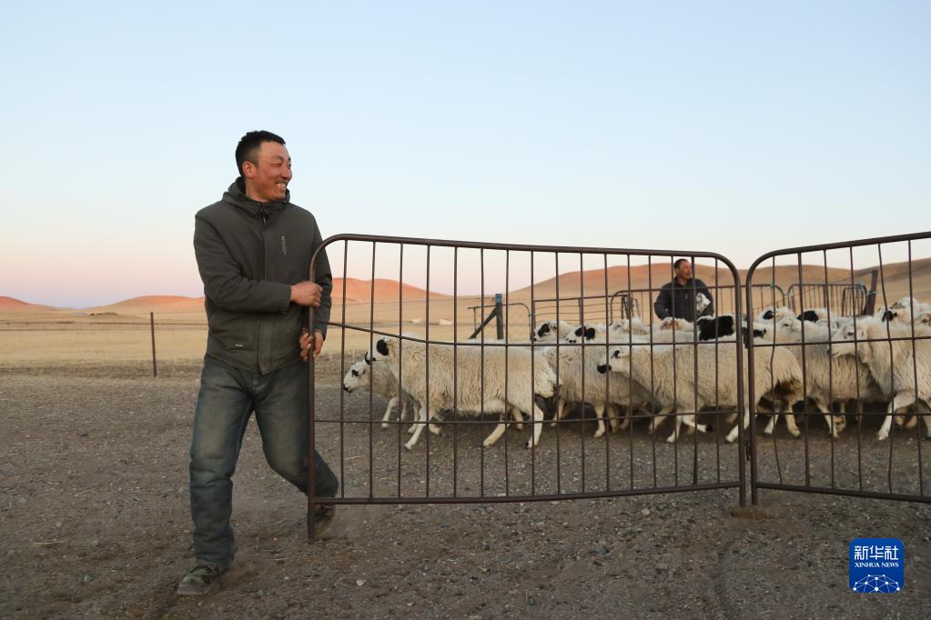 3月28日,朝克德力根打開(kāi)圍欄,將羊群趕進(jìn)羊圈。