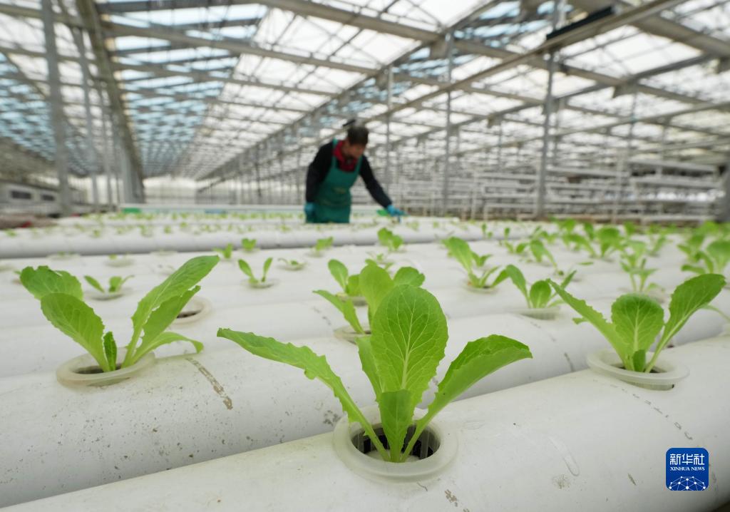 4月3日,工人在秦皇島市撫寧區墳坨鎮一處“農光互補”項目的智能光伏溫室內管護水培蔬菜。