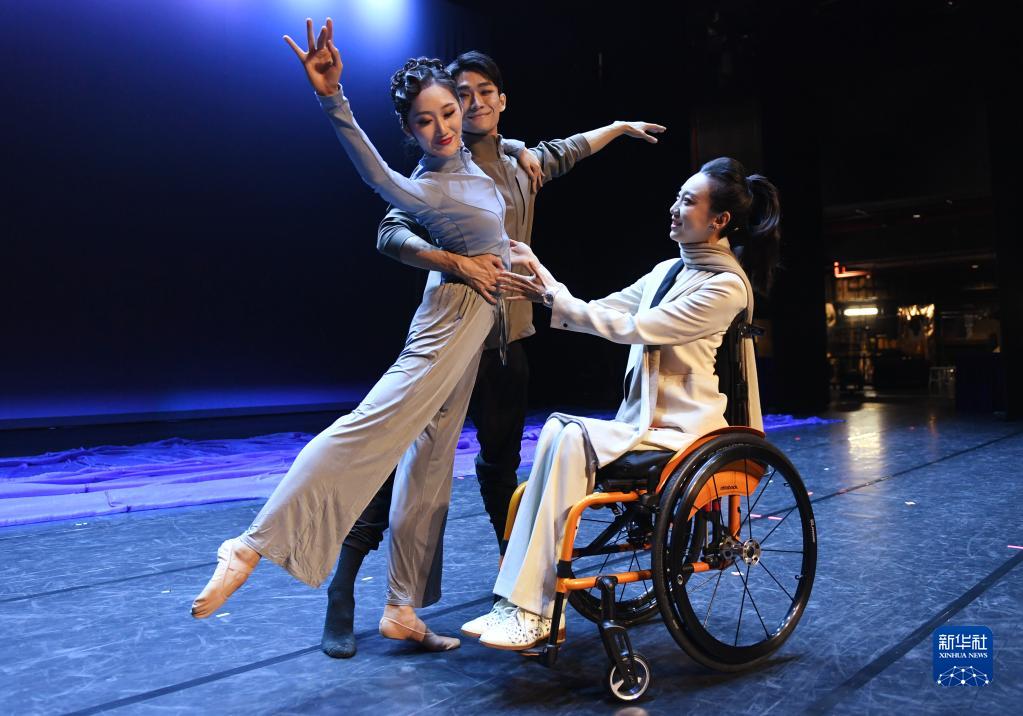 4月3日,舞劇《藍色裙擺》總導演劉巖(右)在演出前指導演員排練。
