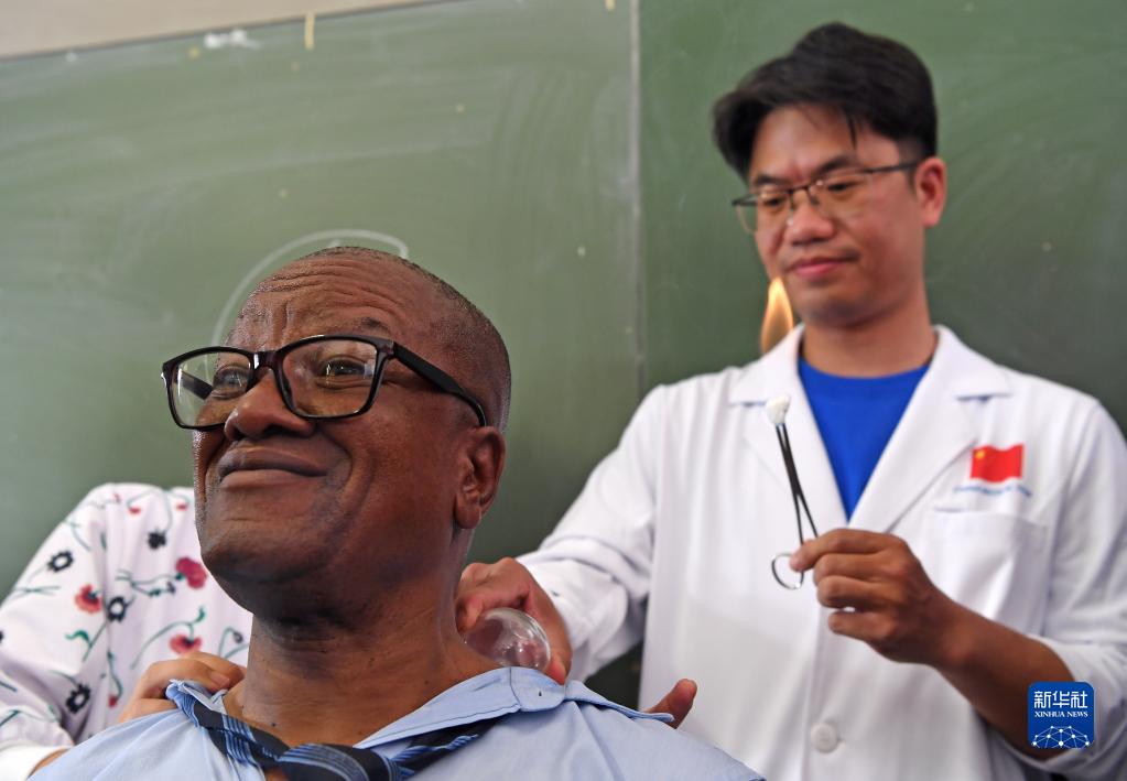 4月3日,在納米比亞溫得和克的伊曼紐爾·謝菲迪中學(xué)課堂上,校長(cháng)卡奇翁瓜體驗拔火罐。