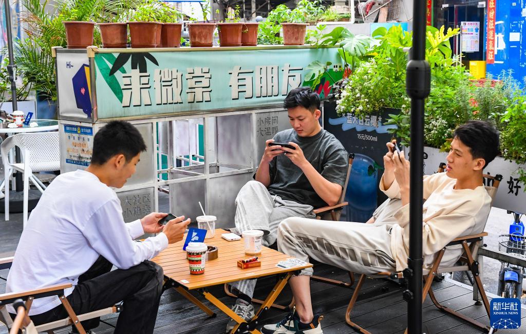 4月2日,在深圳市龍華區元芬村,居民在社區飲品店休閑。