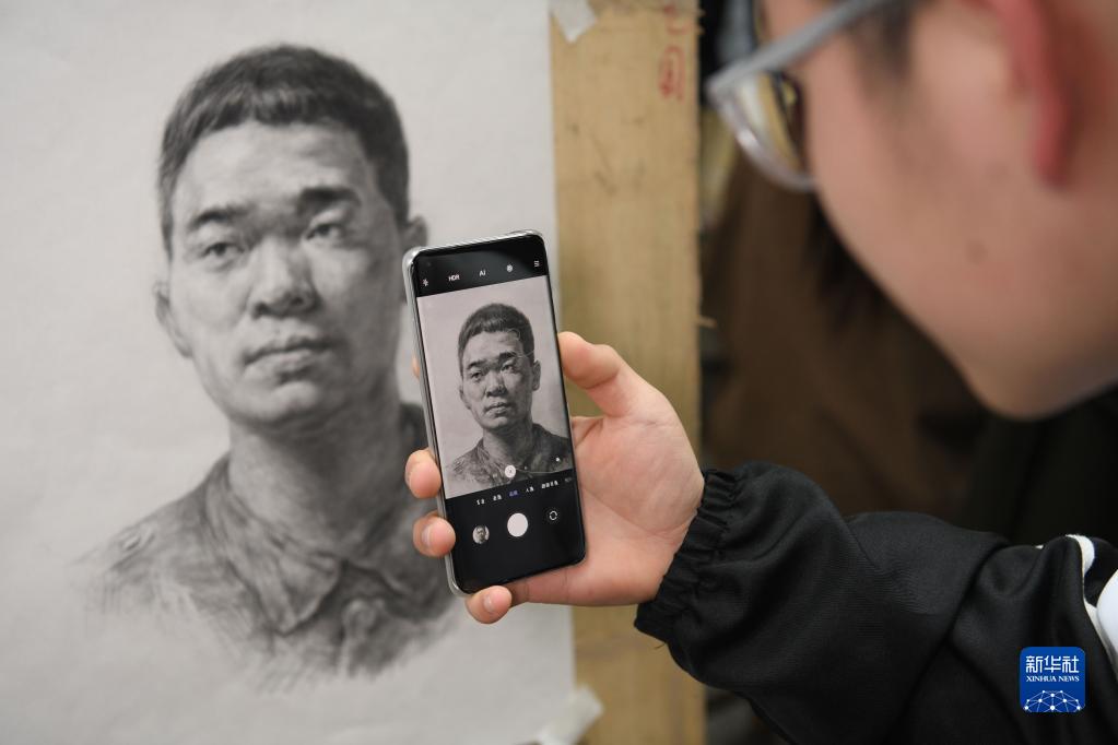 3月31日,安徽師范大學(xué)的大學(xué)生俞家瑞用手機拍攝自己創(chuàng )作的烈士畫(huà)像。
