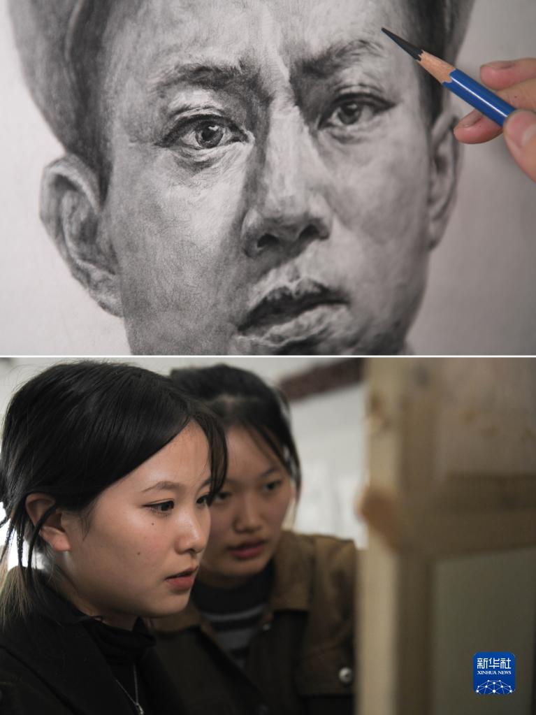 上圖是安徽師范大學(xué)的“00后”大學(xué)生胡守瑩畫(huà)的烈士畫(huà)像;下圖為胡守瑩(前)為烈士畫(huà)像(拼版照片,3月31日攝)。