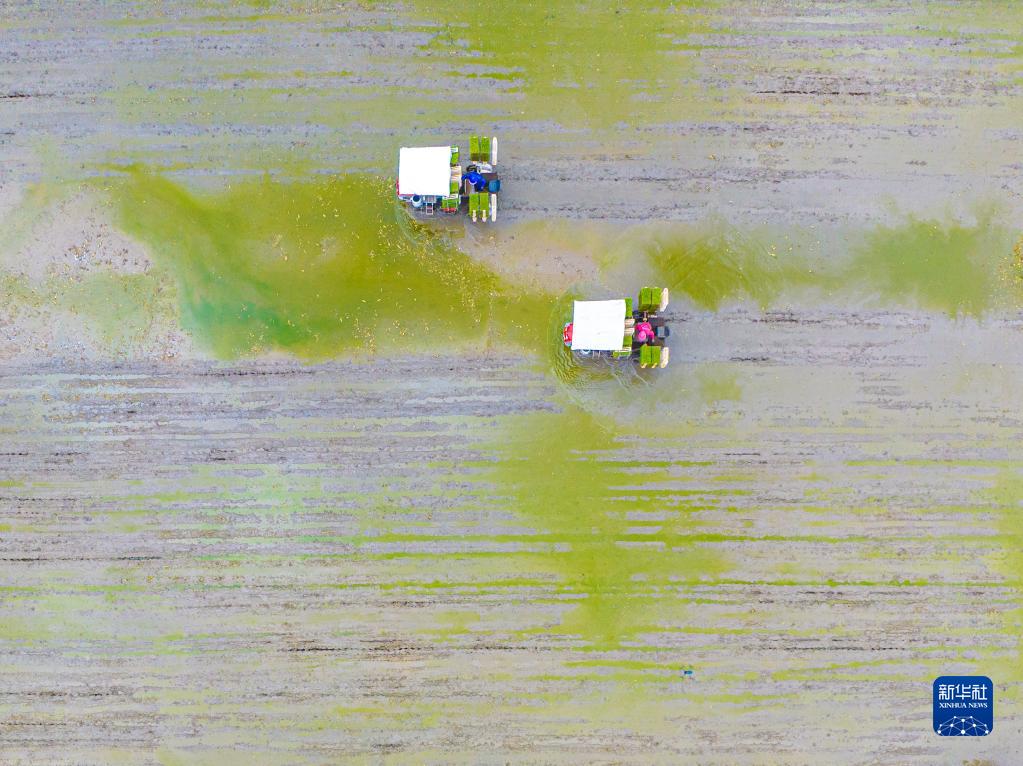 4月4日,浙江省溫嶺市城南鎮農民駕駛插秧機在田間作業(yè)(無(wú)人機照片)。