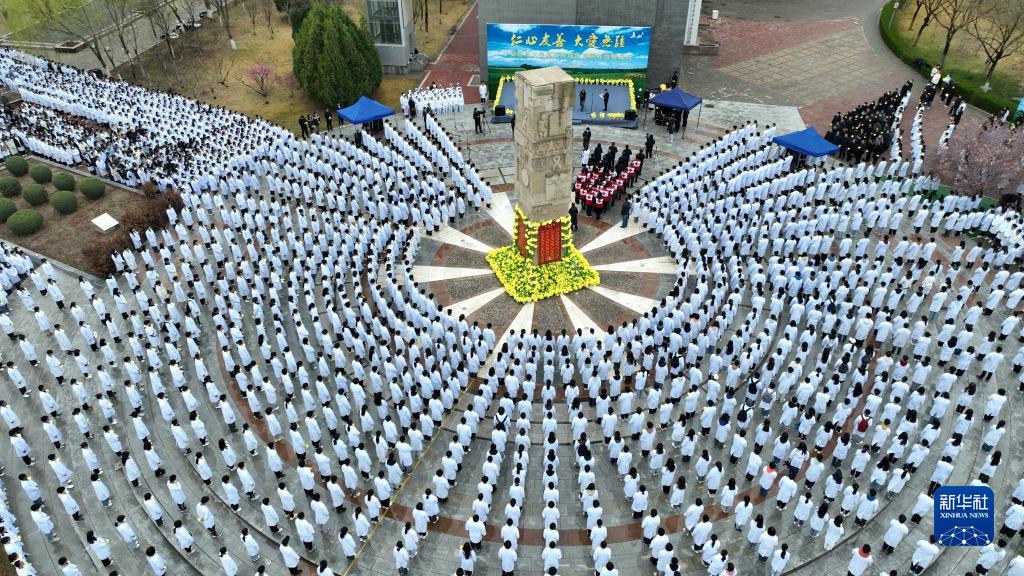4月4日拍攝的寧夏醫科大學(xué)向遺體捐獻者致敬儀式現場(chǎng)(無(wú)人機拍攝)。