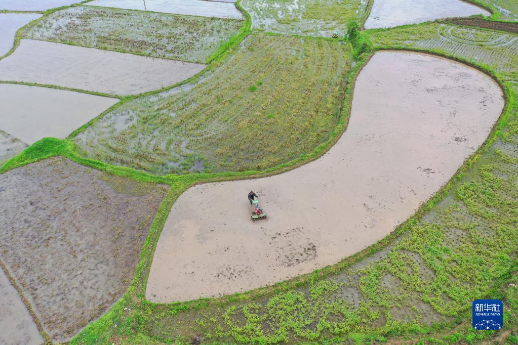 4月5日,湖南省永州市道縣白馬渡鎮樟武坊村村民在翻耕水田(無(wú)人機照片)。