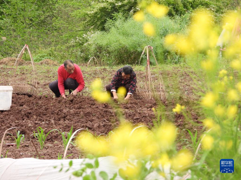 4月5日,村民在四川省達州市渠縣合力鎮雙土社區移栽玉米秧苗。