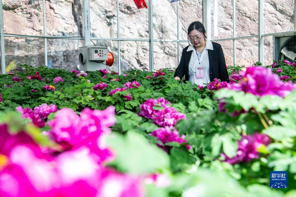 4月6日,工作人員在溫室大棚內查看牡丹生長(cháng)情況。