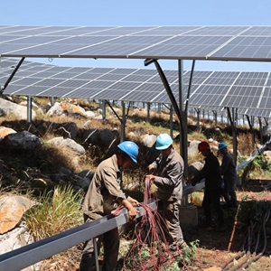 4月6日,工人在硯山縣平遠小石巖光伏電站安裝電線(xiàn)。