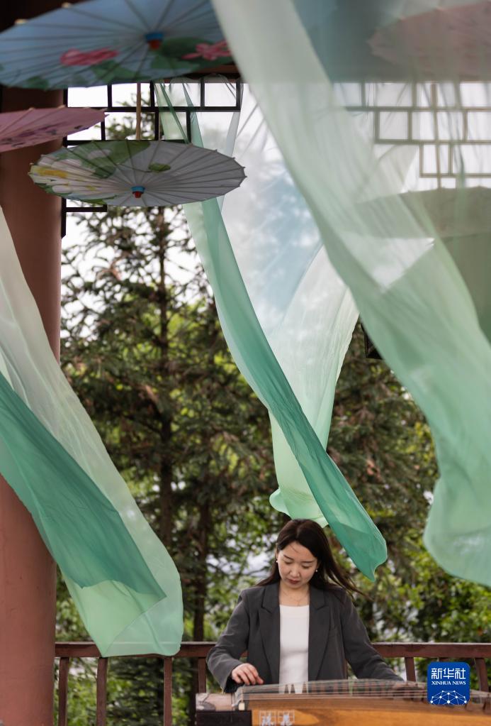 4月6日,一名游客在青杠坪村茶園中的涼亭彈古箏。