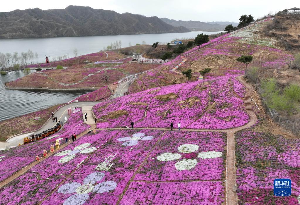 4月6日,游客在遷西縣大黑汀水庫東岸的芝櫻花海觀(guān)光(無(wú)人機照片)。