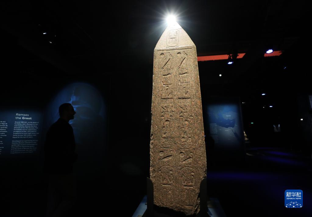 4月6日,媒體記者在法國巴黎參觀(guān)刻有拉美西斯二世名字的方尖碑的一部分。