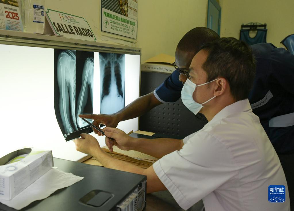 3月21日,在塞內加爾迪亞姆尼亞久兒童醫院,中國第19批援塞內加爾醫療隊影像科醫生江文匡與當地醫生一起查看患者的影像檢查結果。