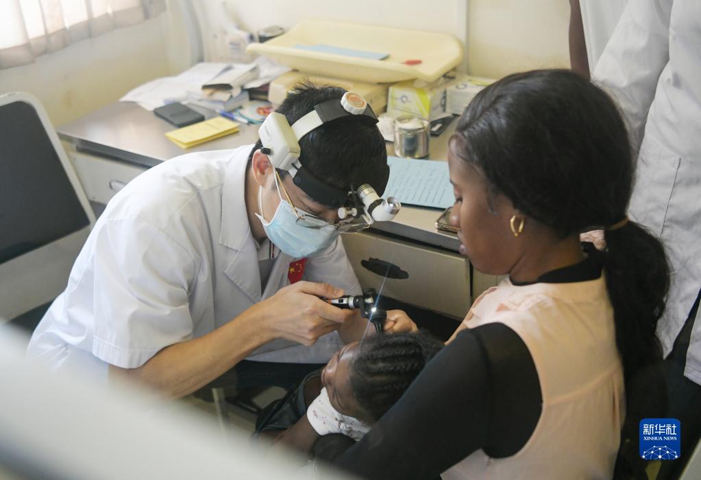 3月21日,在塞內加爾迪亞姆尼亞久兒童醫院,中國第19批援塞內加爾醫療隊耳鼻喉頭頸外科醫生蔡志良為患兒做檢查。