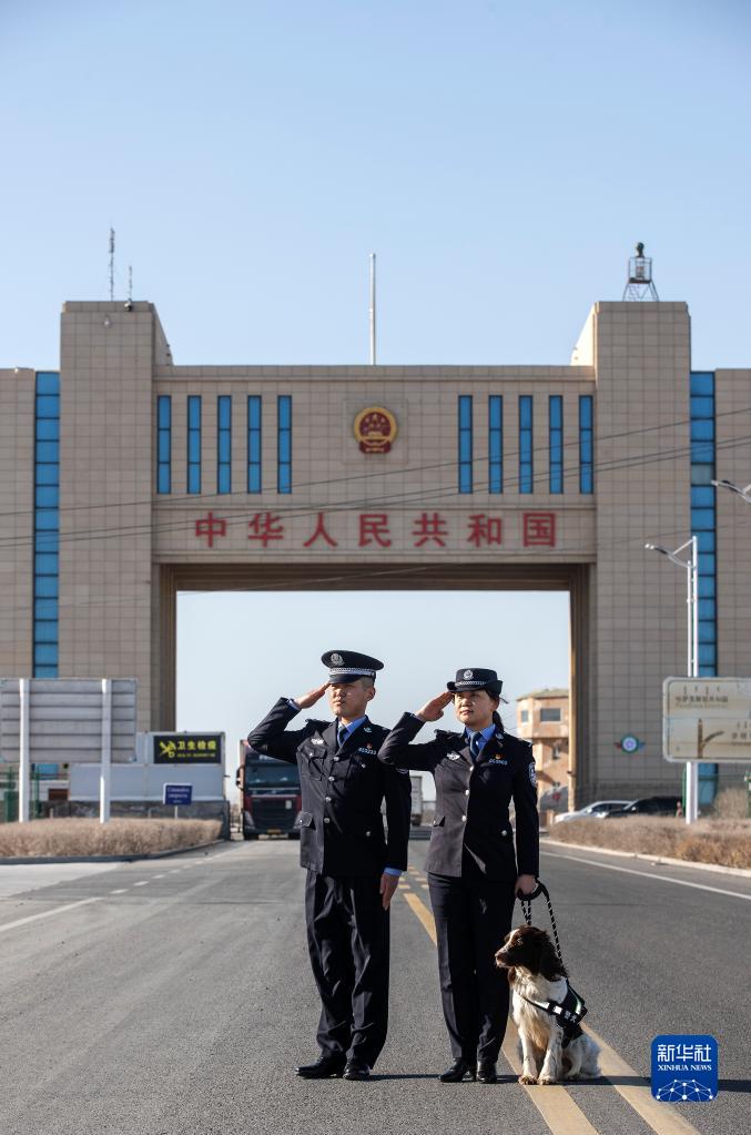 4月3日,崔洪武(左)、劉欣和警犬康欣在國門(mén)前合影。
