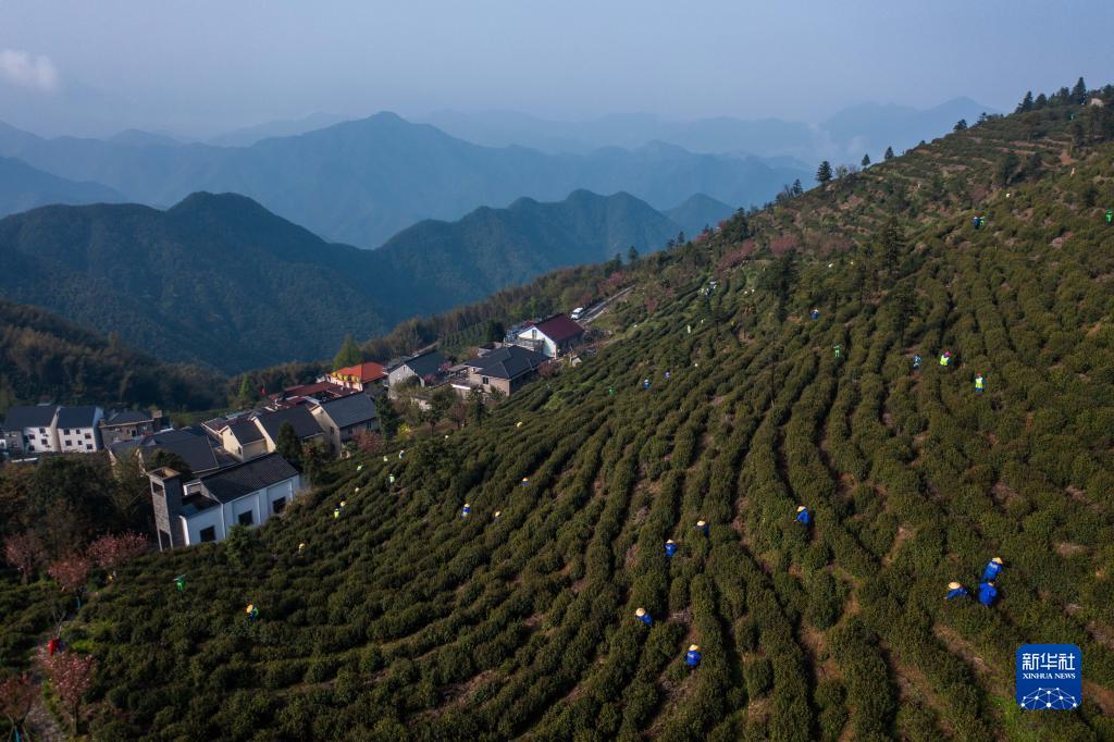 4月7日,安頂村的茶農在采摘安頂云霧茶(無(wú)人機照片)。