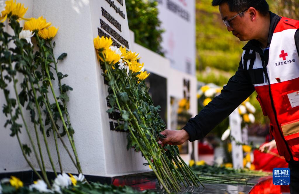 4月7日,參加活動(dòng)的志愿者在現場(chǎng)獻花。