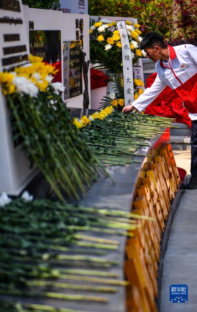 4月7日,參加活動(dòng)的志愿者在現場(chǎng)獻花。