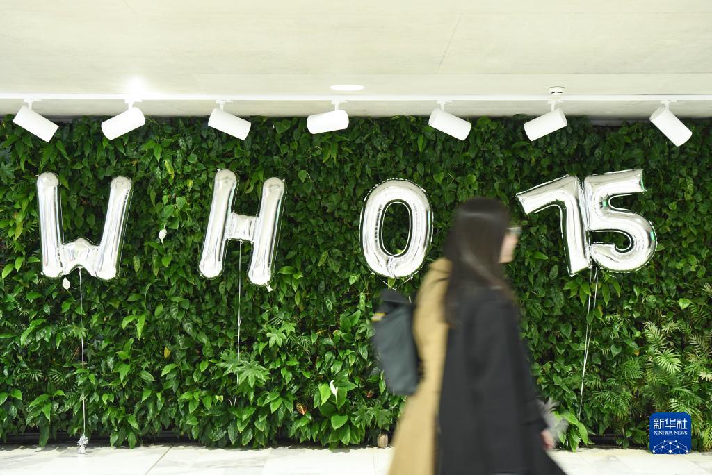 4月6日,在瑞士日內瓦世界衛生組織總部,工作人員走過(guò)慶祝世衛組織成立75周年的裝飾墻。