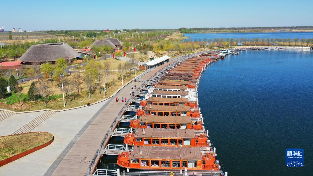 4月7日,白洋淀“水上巴士”項目畫(huà)舫船在白洋淀旅游碼頭內??浚o(wú)人機照片)。
