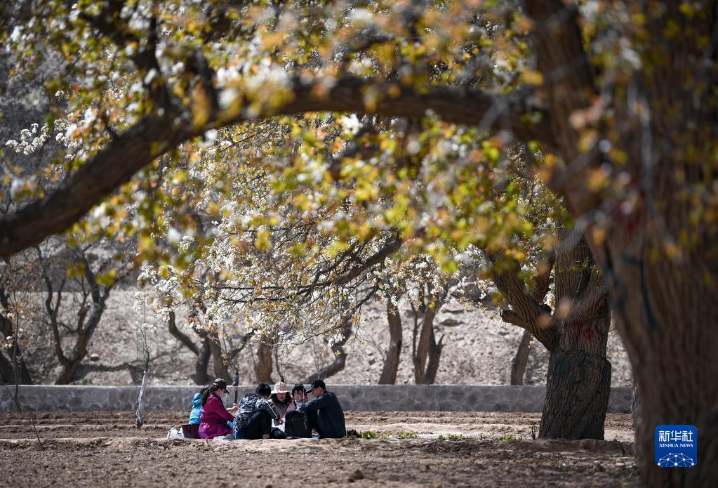 4月7日,游客在南長(cháng)灘村梨樹(shù)下野炊。