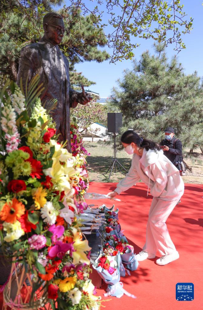 4月7日,參觀(guān)者在新落成的傅雷銅像前獻花。