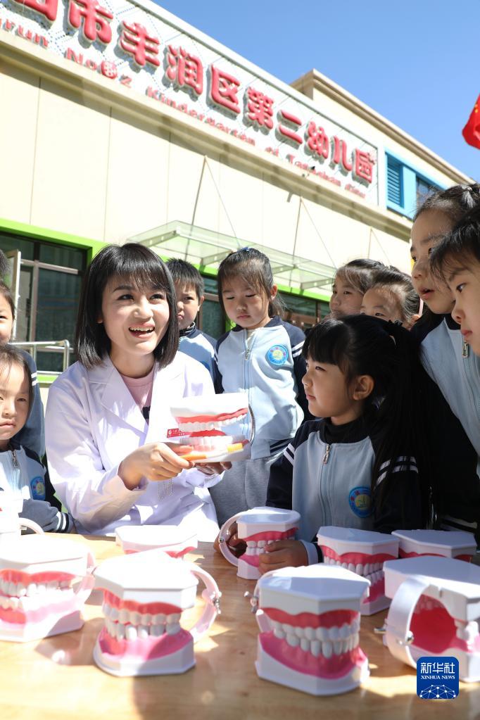 4月7日,河北省唐山市豐潤區婦幼保健院醫護人員在幼兒園向小朋友講解正確的刷牙方法。