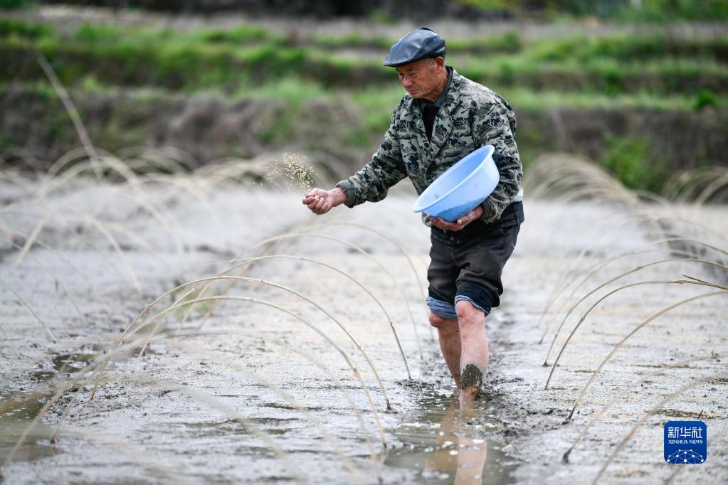 4月7日,村民在貴州省岑鞏縣天馬鎮天馬村雜交水稻制種基地播種。