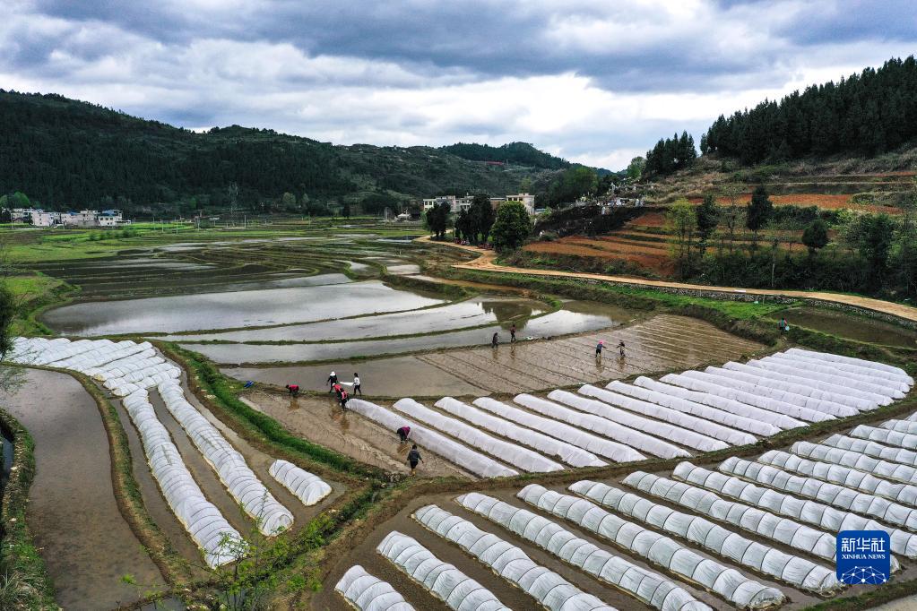 4月6日,村民在貴州省岑鞏縣水尾鎮新場(chǎng)村雜交水稻制種基地播種和覆膜(無(wú)人機照片)。
