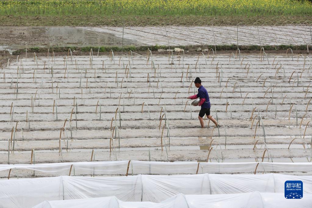 4月7日,村民在貴州省岑鞏縣天馬鎮天馬村雜交水稻制種基地播種。