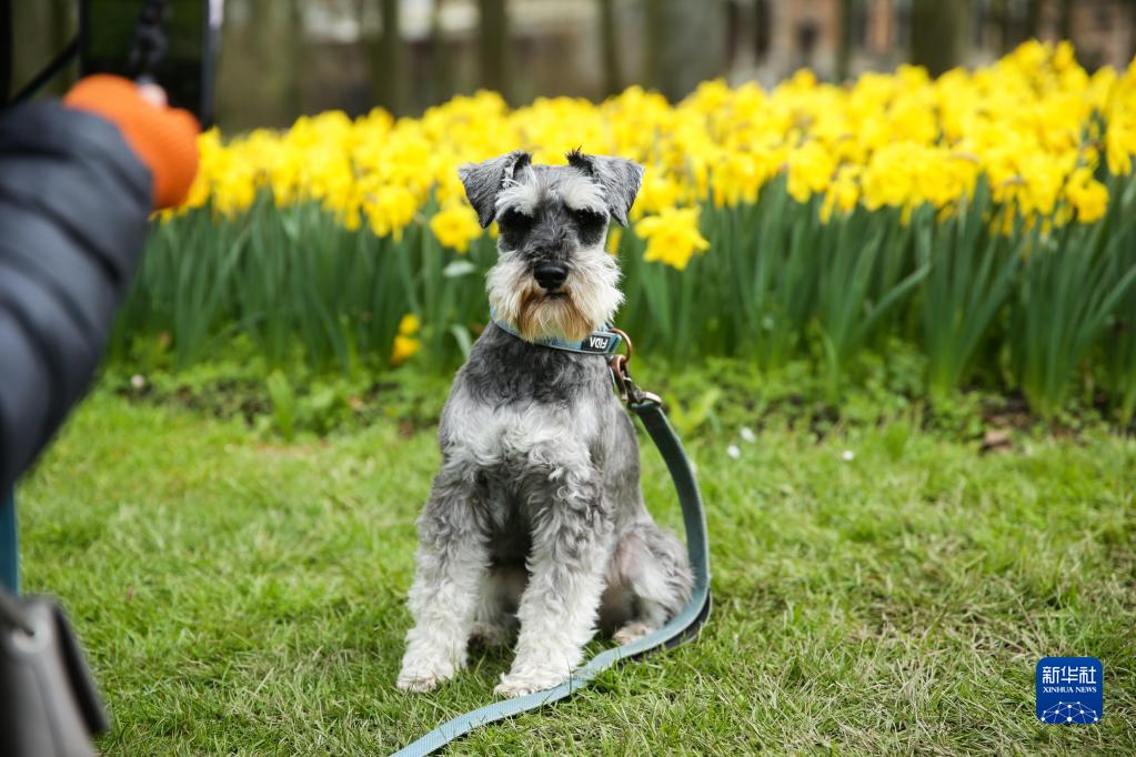 4月7日,在比利時(shí)首都布魯塞爾以西的拜加登城堡園林,一名參觀(guān)者在花叢旁為寵物狗拍照。