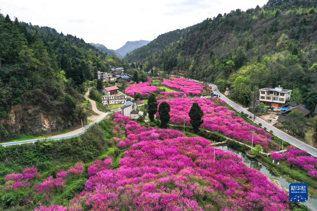 4月7日在貴州省岑鞏縣天馬鎮玉門(mén)洞景區拍攝的紫荊花園(無(wú)人機照片)。