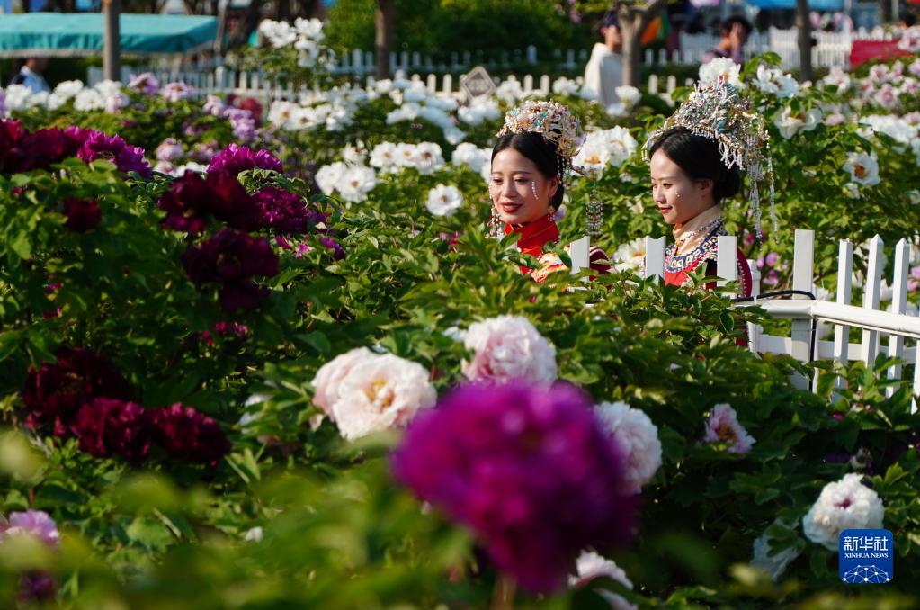 4月7日,在山東省菏澤市牡丹區的曹州牡丹園,游客在觀(guān)賞牡丹花。