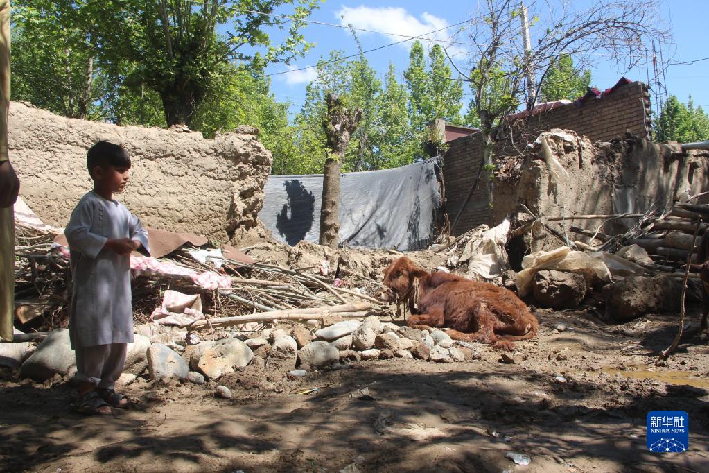 4月6日,在阿富汗塔哈爾省班吉地區,一名男孩站在受損建筑旁。