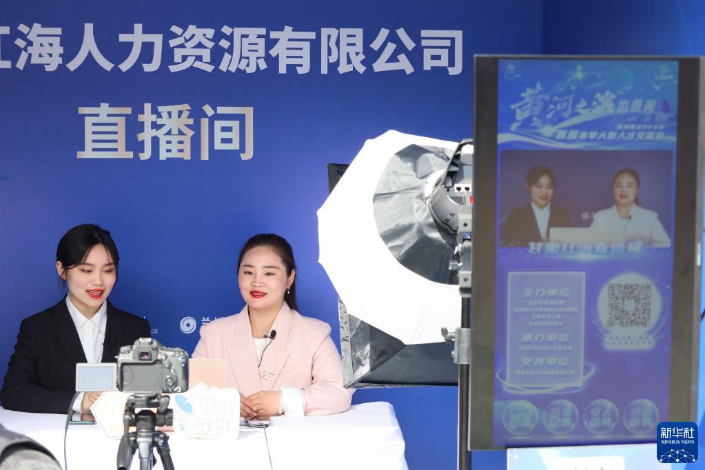 4月8日,主播在蘭州市春季人才交流會(huì )現場(chǎng)進(jìn)行直播帶崗。