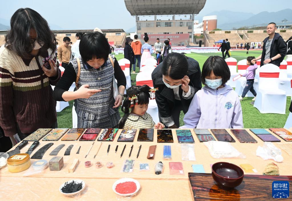 4月8日,參觀(guān)者在福州大學(xué)城“優(yōu)秀傳統文化進(jìn)校園”開(kāi)幕式上欣賞福州漆藝制品。