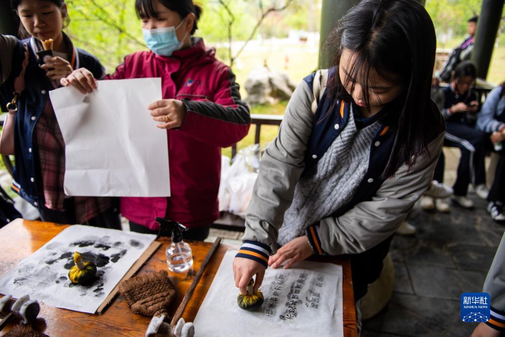 4月8日,游客在常德桃花源風(fēng)景名勝區體驗拓印。
