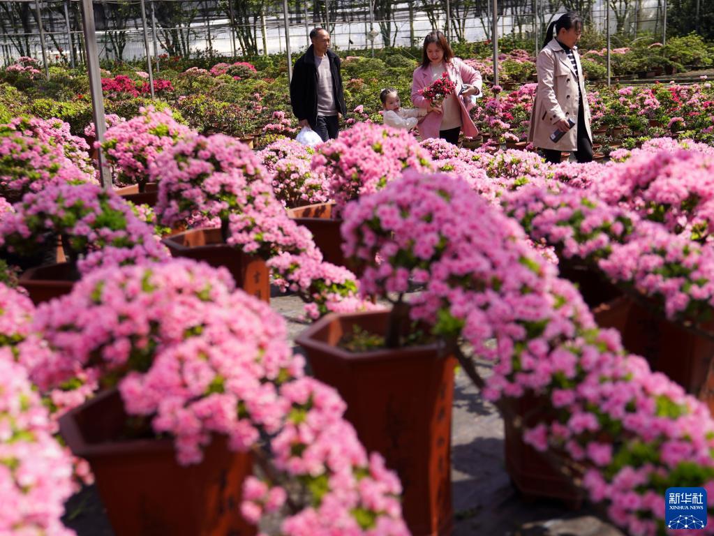 4月8日,游客在嘉善縣大云鎮碧云花園的杜鵑花盆景生產(chǎn)區參觀(guān)游覽。