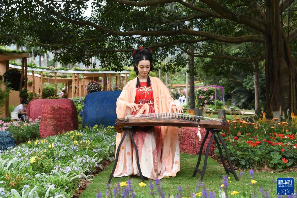 4月8日,一名女子在2023粵港澳大灣區花展現場(chǎng)進(jìn)行民樂(lè )表演。