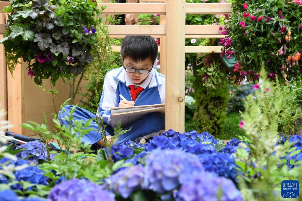 4月8日,在2023粵港澳大灣區花展現場(chǎng),一名小朋友在寫(xiě)生。