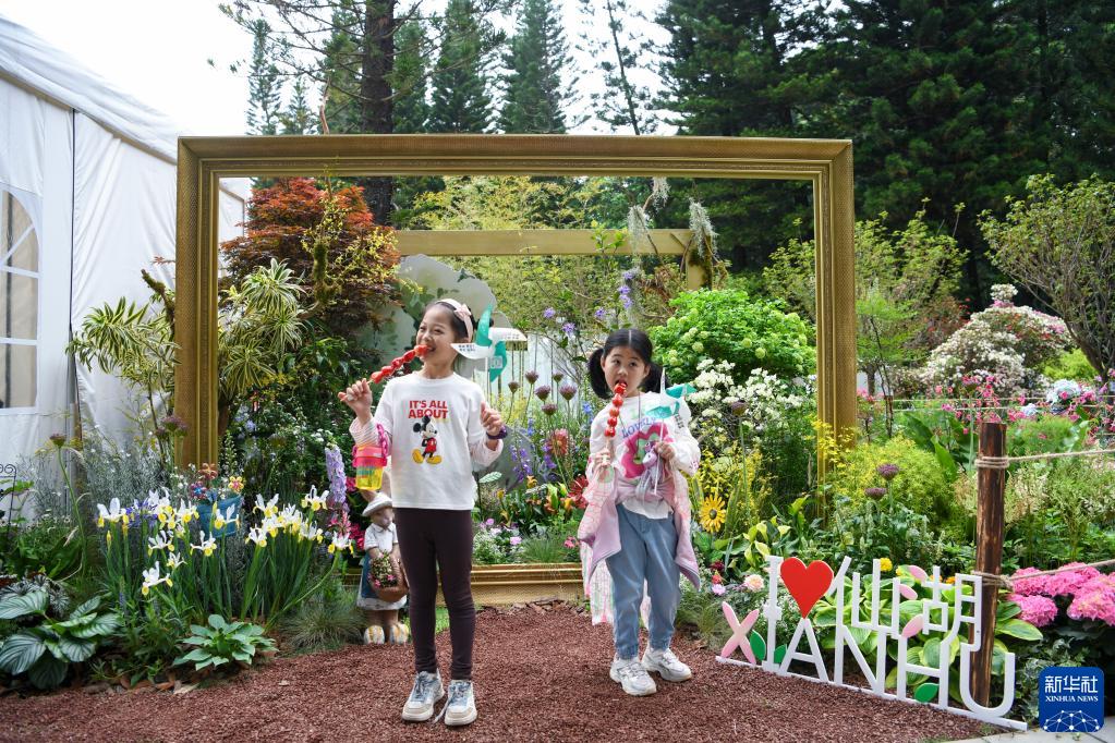 4月8日,兩名小朋友在花展現場(chǎng)留影。