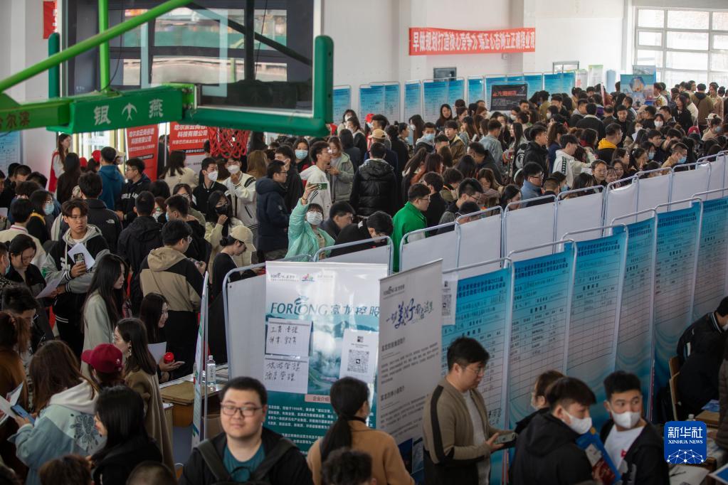 4月8日,在黑龍江工商學(xué)院松北校區體育館,求職者參加黑龍江省民辦高校就業(yè)協(xié)作體2023屆聯(lián)合招聘會(huì )。