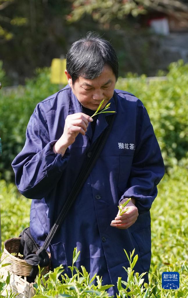 4月8日,在黃山市黃山區新明鄉猴坑村茶園,國家級非遺項目太平猴魁制作技藝代表性傳承人方繼凡在觀(guān)察茶葉品質(zhì)。