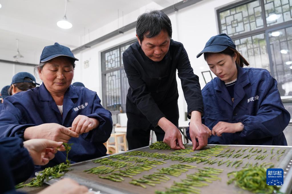 4月8日,在黃山市黃山區新明鄉猴坑村,國家級非遺項目太平猴魁制作技藝代表性傳承人方繼凡(右)指導員工對試采的早熟茶進(jìn)行理條。