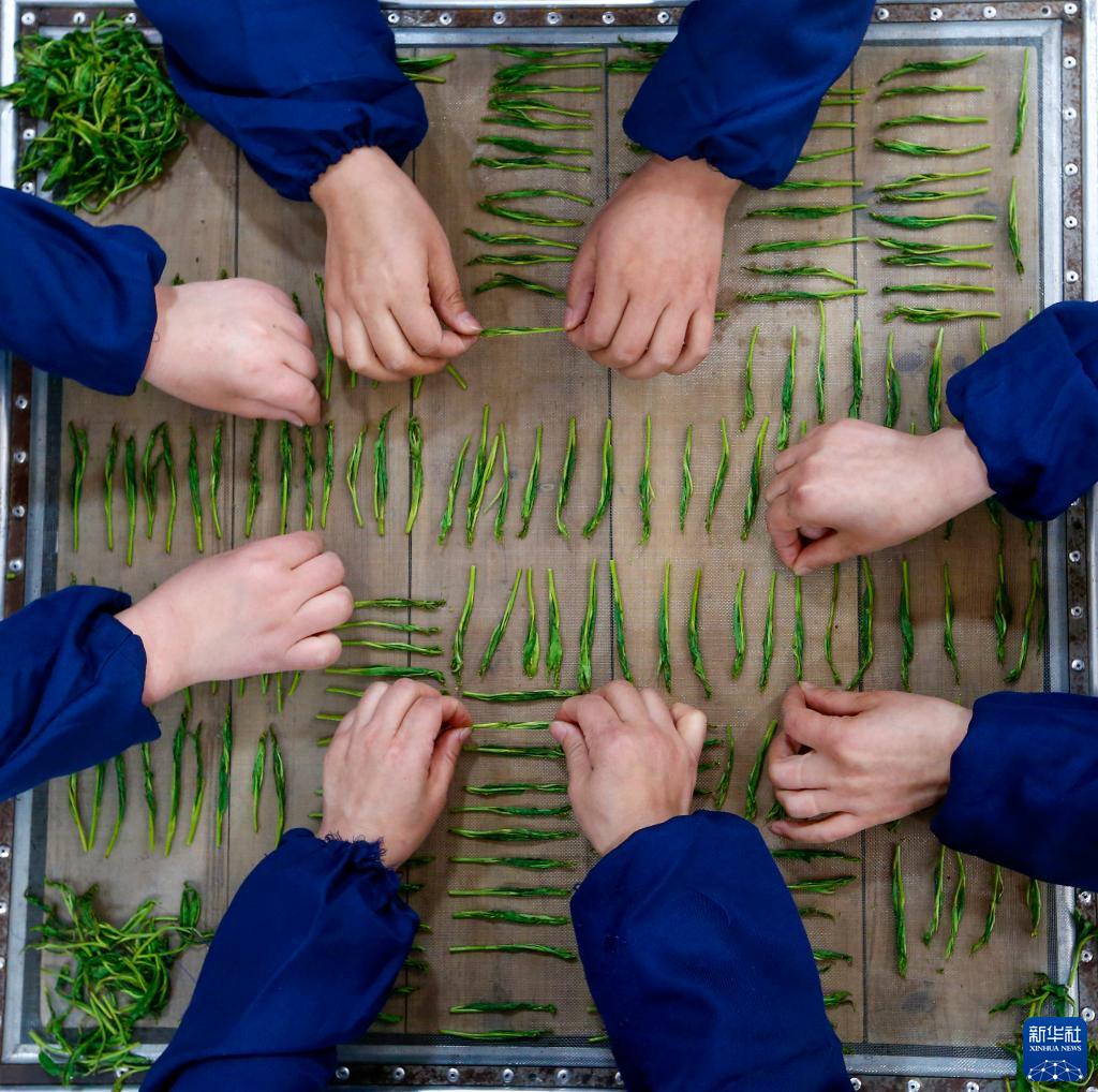 4月8日,黃山市黃山區新明鄉猴坑村生態(tài)茶園的茶工將殺青后的太平猴魁捏尖。