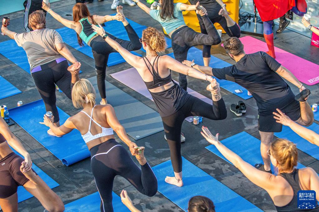 當日,數十名瑜伽愛(ài)好者在曼谷王權云頂大廈頂層觀(guān)景平臺體驗高空瑜伽。