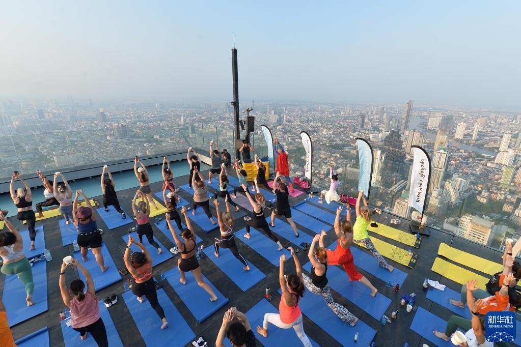 當日,數十名瑜伽愛(ài)好者在曼谷王權云頂大廈頂層觀(guān)景平臺體驗高空瑜伽。
