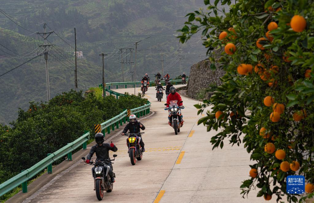 4月7日,摩托車(chē)愛(ài)好者在秭歸縣水田壩鄉橙園公路體驗騎行樂(lè )趣。